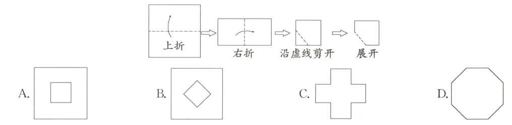6. 如图所示,把一个正方形对折两次后沿虚线剪开,展开后所得的图形是(
