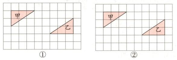 图①中将图形甲向右平移5格,再向下平移1格就能与图形乙拼成一个长方形。图②中将图形甲向右平移5格,再向下平移3格就能与图形乙拼成一个平行四边形。(叙述正确即可)