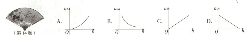 14.C 解析:本题考查正比例函数的应用、扇形的面积公式.如图,设OA = r,OB = R.由题意,得$m = \frac{S_n}{S} = \frac{\frac{n\pi(R^2 - r^2)}{360}}{\frac{n}{120}} = \frac{n}{120},$