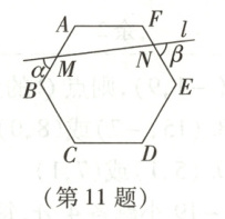 11. 直线$l$与正六边形$ABCDEF$的边$AB$,$EF$分别相交于点$M$,$N$,如图所示,则$\alpha + \beta$ =(