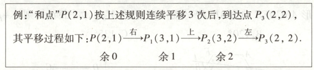 16.D 解析:本题考查坐标内点的平移运动.由点$P_3(2,$2)可知横、纵坐标之和除以3所得的余数为1,继而向上平移1个单位长度得到$P_4(2,$3),此时横、纵坐标之和除以3所得的余数为2,继而向左平移1个单位长度得到$P_5(1,$3),此时横、纵坐标之和除以3所得的余数为1,又要向上平移1个单位长度……因此发现规律为若“和点”横、纵坐标之和除以3所得的余数为0时,先向右平移1个单位长度,之后按照向上、向左、向上、向左不断重复的规律平移.若“和点”Q按上述规律连续平移16次后,到达点$Q_{16}(-1,$9),则按照“和点$”Q_{16}$反向运动16次求点Q坐标理解,可以分为两种情况:$①Q_{16}$先向右平移1个单位长度得到$Q_{15}(0,$9),此时横、纵坐标之和除以3所得的余数为0,应该是$Q_{15}$向右平移1个单位长度得到$Q_{16},$故矛盾,不成立;$②Q_{16}$先向下平移1个单位长度得到$Q_{15}(-1,$8),此时横、纵坐标之和除以3所得的余数为1,则$Q_{15}$应该向上平移1个单位长度得到$Q_{16},$故符合题意,那么点$Q_{16}$先向下平移,再向右平移,当平移到第15次时,共计向下平移了8次,向右平移了7次,此时坐标为(-1 + 7,9 - 8),即(6,1),那么最后一次若向右平移则为(7,1),若向左平移则为(5,1).故选D.