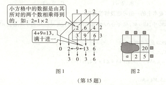 15. “铺地锦”是我国古代一种乘法运算方法,可将多位数乘法运算转化为一位数乘法和简单的加法运算,淇淇受其启发,设计了如图1所示的“表格算法”,图1表示$132× 23$,运算结果为3036. 图2表示一个三位数与一个两位数相乘,表格中部分数据被墨迹覆盖,根据图2中现有数据进行推断,正确的是(