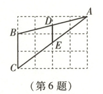 6. (2025·河南)在如图所示的网格中,每个小正方形的边长均为$1$,$\triangle ABC$的三个顶点均在网格线的交点上,点$D$,$E$分别是边$BA$,$CA$与网格线的交点,连接$DE$,则$DE$的长为 (