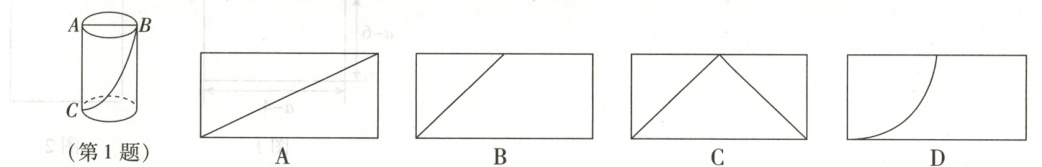 1. (2025·四川遂宁)如图,圆柱的底面直径为AB,高为AC,一只蚂蚁在点C处,沿圆柱的侧面爬到点B处,现将圆柱侧面沿AC剪开,在侧面展开图上画出蚂蚁爬行的最短路线,正确的是(