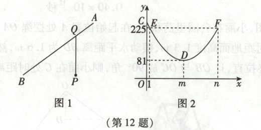 12. (2025·浙江)为了实时规划路径,卫星导航系统需要计算运动点与观测点之间距离的平方。如图1,点$P$是一个固定观测点,运动点$Q$从$A$处出发,沿笔直公路$AB$向目的地$B$处运动。设$AQ = x$(单位:km)$(0 ≤ x ≤ n)$,$PQ^2 = y$(单位:$km^2$)。如图2,$y$关于$x$的函数图象与$y$轴交于点$C$,最低点$D(m, 81)$,且经过$E(1, 225)$和$F(n, 225)$两点,下列选项正确的是(