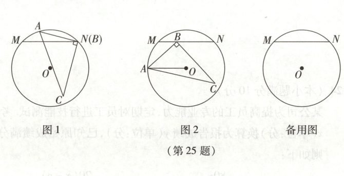 已知$\odot O$的半径为3,弦$MN = 2\sqrt{5}$. 在$\triangle ABC$中,$\angle ABC = 90^{\circ}$,$AB = 3$,$BC = 3\sqrt{2}$. 在平面上,先将$\triangle ABC$和$\odot O$按图1位置摆放(点$B$与点$N$重合,点$A$在$\odot O$上,点$C$在$\odot O$内),随后移动$\triangle ABC$使点$B$在弦$MN$上移动,点$A$始终在$\odot O$上随之移动. 设$BN = x$.