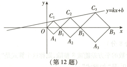 12. 如图,在平面直角坐标系中,正方形OA₁B₁C₁,B₁A₂B₂C₂,B₂A₃B₃C₃,…的顶点B₁,B₂,B₃,…在x轴上,顶点C₁,C₂,C₃,…在直线y = kx + b上,已知OB₁ = 2,B₁B₂ = 3。