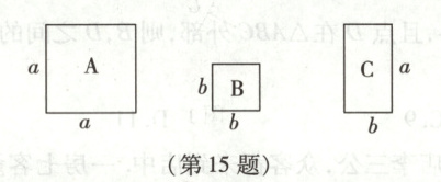 15. 现有A,B,C三种不同的矩形纸片若干张(边长如图所示)。若要拼成一个长为3a + 2b,宽为2a + b的矩形,则需要A种纸片和C种纸片共