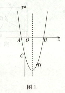 如图1,在平面直角坐标系中,二次函数y = x² + bx + c的图象与x轴交于A,B两点,对称轴为直线x = 2,与y轴交于点C(0,−5),点D为抛物线上任意一点。