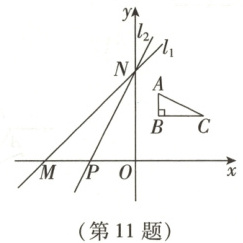 11. 如图,在平面直角坐标系中,直线$l_{1}:y = x + 4$的图象与$x$轴、$y$轴交于点$M$,$N$,直线$l_{2}:y = kx + b$经过点$N$,且与$x$轴交于$OM$的中点$P$,以$A(1,3)$,$B(1,2)$,$C(3,2)$为顶点的$\triangle ABC$在第一象限内,将$\triangle ABC$向左平移$n$个单位长度。若$\triangle ABC$的各边始终与直线$l_{1}$或直线$l_{2}$有交点,则$n$的取值范围是(