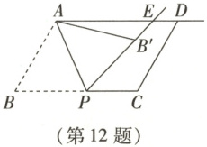 12. 如图,在$□ ABCD$中,$AB = 4$,$BC = 6$,$\angle B = 60^{\circ}$,$P$是$BC$边上的动点$(BP > 2)$,将$\triangle ABP$沿$AP$翻折得$\triangle AB'P$,射线$PB'$与射线$AD$交于点$E$。下列说法正确的个数是(