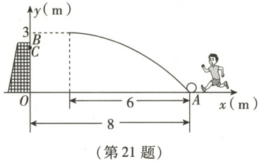 如图,在一次足球训练中,某球员从球门(原点$O$处)正前方$8m$的$A$处射门,球射向球门的路线可近似成一条抛物线,当球飞行的水平距离为$6m$时,球达到最高点,此时球离地面的高度为$3m$。