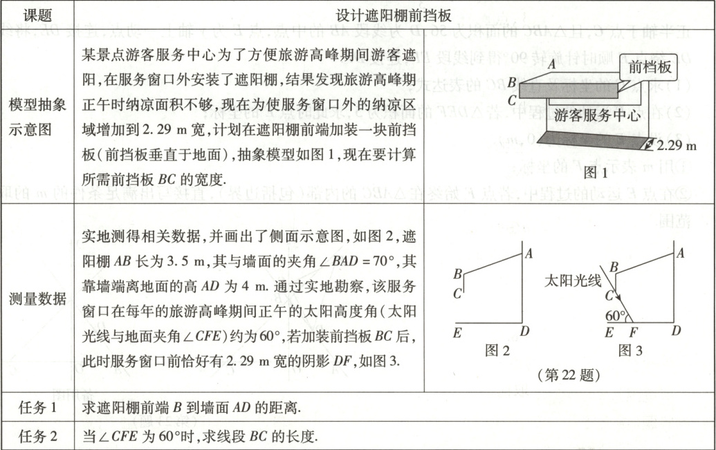 答:遮阳棚前端B到墙面AD的距离约为3.29m.4分