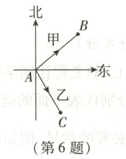 6. 如图,甲、乙两人同时从A地出发,甲沿北偏东50°方向步行前进,乙沿图示方向步行前进。当甲到达B地,乙到达C地时,甲与乙前进方向的夹角∠BAC为100°,则此时乙位于A地的(