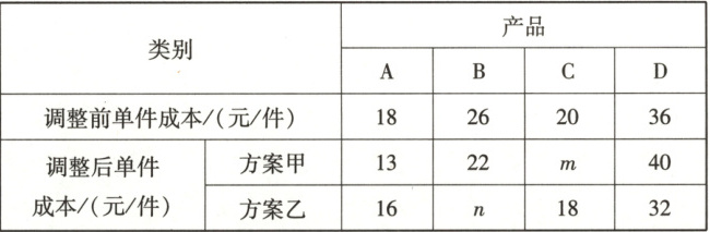 某工厂生产A,B,C,D四种产品,为提升产品的竞争力,该工厂计划对部分种类的产品优化生产流程,降低成本;对其他种类的产品增加研发投入,提升品质. 经研究,该工厂做出了甲、乙两种调整方案,这两种方案将对四种产品的成本产生不同的影响,下面是该工厂这四种产品的部分信息: