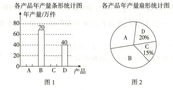 (1)$40 ÷ 20\% = 200$(万件),$200 × 15\% = 30$(万件),A产品的年产量:$200 - 30 - 40 - 70 = 60$(万件).