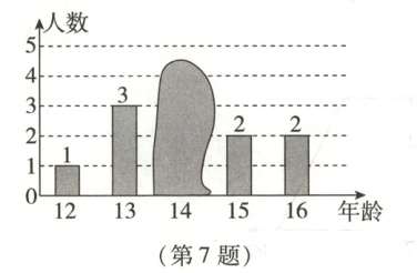 7. 某学校篮球队所有队员的年龄(单位:岁)只有12,13,14,15,16这五种情况,如图所示,其中部分数据因破损无法看到。若队员年龄的唯一的众数与中位数相等,则年龄为14岁的队员人数可能是(