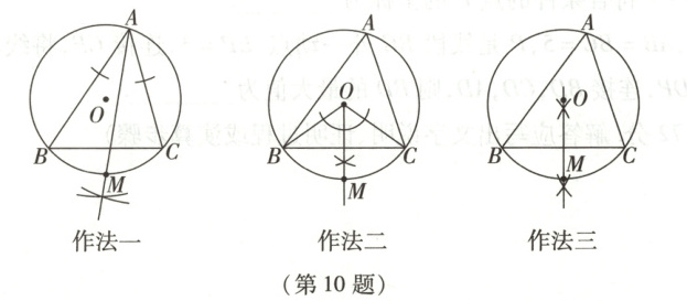 10. ⊙O是△ABC的外接圆,在$\overset{\frown}{BC}$上找一点M,使点M平分$\overset{\frown}{BC}$。对图中的三种作法,下列说法正确的是(