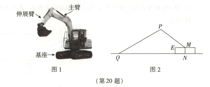 图1是某型号挖掘机,该挖掘机由基座、主臂和伸展臂构成。图2是某种工作状态下的侧面结构示意图。已知PQ是伸展臂,EM//QN,基座高度MN为1m,主臂MP的长为5m,测得主臂伸展角∠PME=37°。