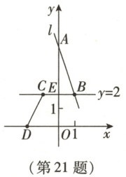 如图,直线$l: y = -3x + 5$分别与y轴及直线y = 2交于点A,B,点C与点B关于y轴对称,直线y = 2与y轴交于点E,D(-2,0),连接CD。