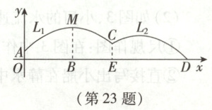 (1)求抛物线$L_1$的表达式(不写x的取值范围),并求运动员乙(点E)到守门员(点O)的距离(结果保留根号);