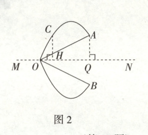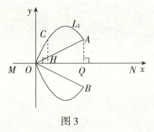 琪琪在学习了二次函数之后,想利用二次函数的知识解决生活中的实际问题. 她观察发现,家中的一款铁艺工艺品(厚度忽略不计)由两个成轴对称的“花瓣”构成,图1是该工艺品的平面示意图,“花瓣”外边缘可以近似地看成抛物线形,内边缘是线段. 如图2,两个“花瓣”公共顶点为O,对称轴为直线MN,内边缘为线段OA,OB,琪琪测得外边缘上一点C与点O的水平距离为1 dm($OH = 1dm$)时,点C到对称轴MN的距离为2 dm($CH = 2dm$),点A与点O的水平距离为4 dm($OQ = 4dm$)时,点A到对称轴MN的距离为2 dm($AQ = 2dm$). 如图3,以O为原点,以直线MN为x轴,建立平面直角坐标系.