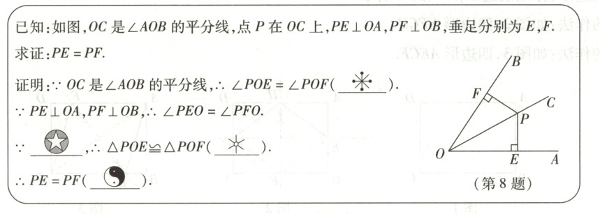 8. 下面是定理:“角平分线上的点到角两边的距离相等”的证明过程,需要补充符号处要填写的内容,则下列选项错误的是(
