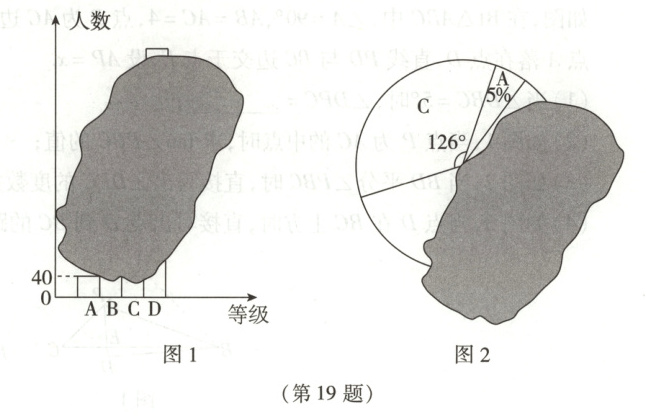 组委会将数据整理后分别绘制了条形统计图1和扇形统计图2,但工作人员不小心把两张统计图沾上了墨汁,只记得$A$,$B$两个等级人数相等.