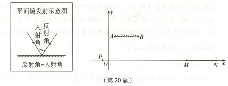 (3)一条感光带$MN$置于$x$轴上,其中$M$,$N$的坐标分别为$(13,0)$,$(18,0)$,光线照到感光带任何一点,感光带都会发光. 请判断入射光线$l_1$经平面镜$AB$反射后的光线$l_2$能否使感光带发光?若能,请直接写出$k$的取值范围;若不能,请说明理由并直接写出将平面镜$AB$至少向右平移多少个单位长度反射光线$l_2$才能使感光带发光.