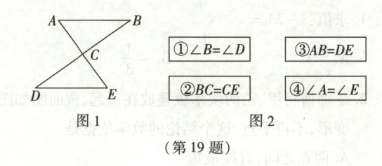 如图1,线段$AE$和$BD$相交于点$C$,连接$AB$,$DE$。四张卡片除正面分别写着如图2所示的四个不同的条件外完全相同,将四张卡片背面朝上洗匀后放在桌面上。