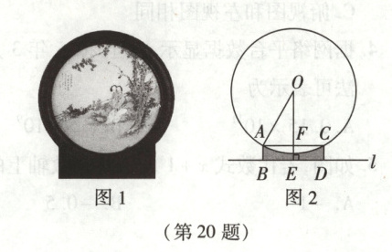 瓷板画(图1)是我国非物质文化遗产,可装裱或嵌入到屏风中,作观赏用。图2为其平面示意图,$A$,$C$为$\odot O$上的两点,连接$OA$,$AC$,$AC// BD$(桌面),$AB$,$CD$分别垂直于直线$l$于$B$,$D$两点,过点$O$作$OE\perp BD$于点$E$,交$AC$于点$F$。已知$AB = CD = 4\sqrt{3} cm$,$AC = 30 cm$,$OE = 19\sqrt{3} cm$。