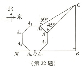 古代数学家杨辉在《详解九章算法》中对“邑的计算”进行了相关研究。数学兴趣小组也类比进行了如下探究:如图,正八边形游乐城$A_{1}A_{2}A_{3}A_{4}A_{5}A_{6}A_{7}A_{8}$的边长为$\frac{\sqrt{2}}{2} km$,南门$O$设立在$A_{6}A_{7}$边的正中央,游乐城南侧有一条东西走向的道路$BM$,$A_{6}A_{7}$在$BM$上(门宽及门与道路间距离忽略不计),东侧有一条南北走向的道路$BC$,$C$处有一座雕塑,在$A_{1}$处测得雕塑在北偏东$45^{\circ}$方向上,在$A_{2}$处测得雕塑在北偏东$59^{\circ}$方向上。(结果精确到0.1 km,参考数据:$\sqrt{2}\approx1.41$,$\sin76^{\circ}\approx0.97$,$\tan76^{\circ}\approx4.00$,$\sin59^{\circ}\approx0.86$,$\tan59^{\circ}\approx1.66$)