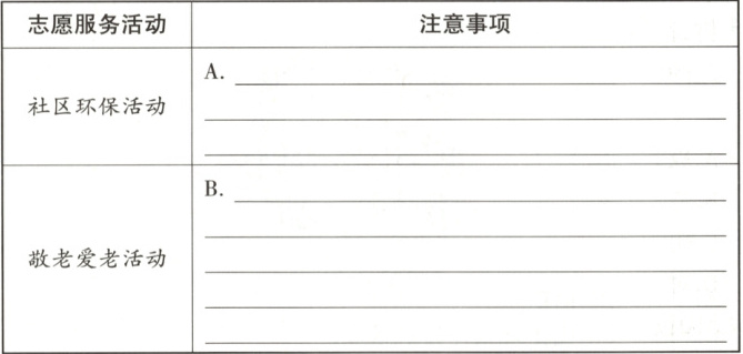 (4)下列是志愿服务分组情况。请你谈谈在参加下列活动的过程中要注意哪些问题。(4分)
