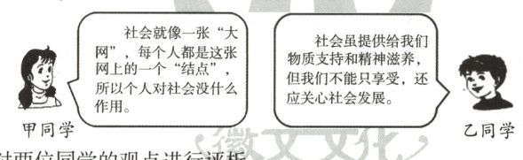 在关于个人与社会关系的讨论中,甲、乙两位同学发表了各自的看法。