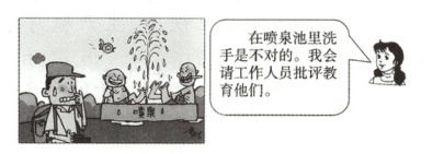 (1)示例:叔叔,喷泉池是供大家观赏的,在里面洗手会破坏水质和环境,也违反了公共规则,我们一起做文明市民,共同维护公共环境好吗?