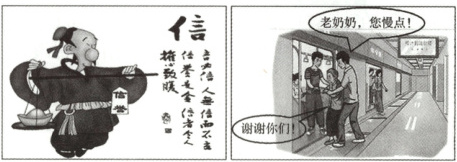6.示例一:选左图:推荐理由如下,①诚信是中华传统美德,是社会主义核心价值观重要内容。②诚信立身。图中商家诚信经营,能赢得顾客信任。③诚信促进社会文明,可减少矛盾,净化风气。④学校宣传此图,有利于引导学生践行诚信,营造良好校园风尚。