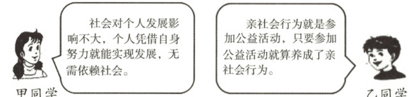 13.两位同学的观点都不正确。①社会为人的生存和发展提供必要条件,我们从社会获取物质支持和精神滋养,个人发展离不开社会。②亲社会行为不仅包括参加公益活动,还涵盖谦让、分享、合作、帮助他人、关心社会发展等多种表现,参加公益活动只是其中一部分。③我们要正确认识个人与社会的紧密联系,明白社会对个人成长的重要性,积极养成亲社会行为,主动了解社会、关注社会,通过多种方式参与社会生活,促进个人成长和社会进步。