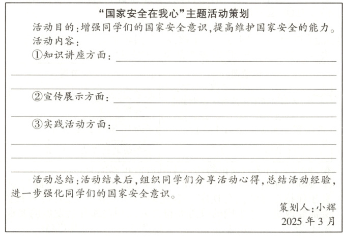 学校准备开展“国家安全在我心”主题活动,老师让小辉负责策划活动内容。