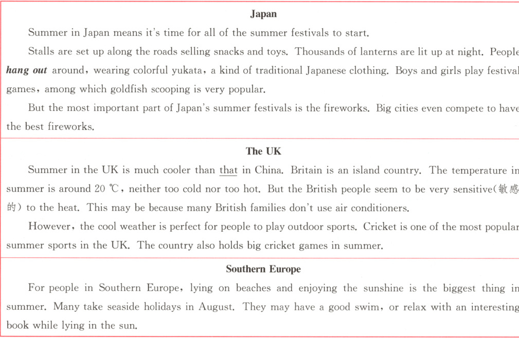 1. B 细节理解题。由“Let’s see how people in Japan, the United Kingdom and Southern Europe spend their summer.”可知,本文主要讲述的是不同国家和地区的人们度过夏季的方式。
