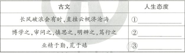 材料二 古诗、古文是古人心声的真实记录,是展现先民人生态度的可靠文本。说到豁达,不禁想起苏轼的“竹杖芒鞋轻胜马,谁怕”;聊到信心,会想起李白的“长风破浪会有时,直挂云帆济沧海”;谈到希望,会想到陆游的“山重水复疑无路,柳暗花明又一村”。