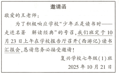 (3)班级读书汇报会活动准备邀请王老师前来参加,学习委员给王老师写了一封邀请函,但由于时间仓促,邀请函出现了一些错误,请你帮助修改。(4分)
