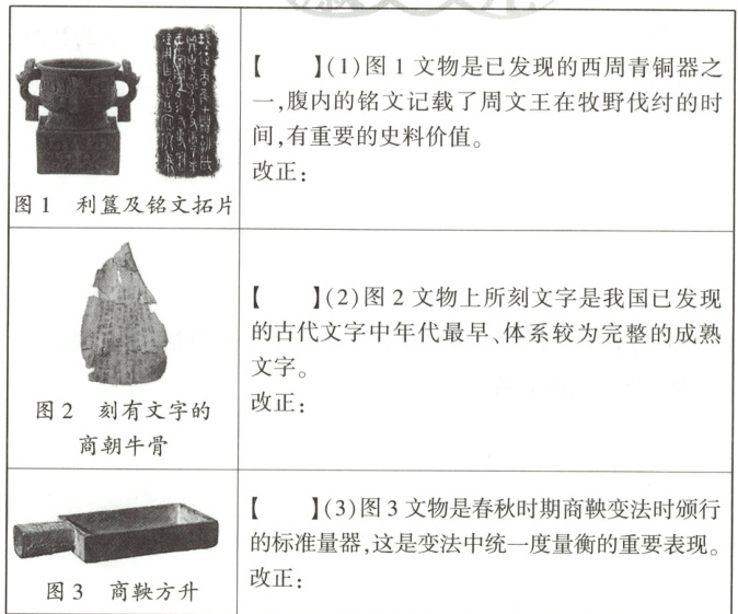 16. 辨别下列文物解说的正误,在该题前的括号内正
