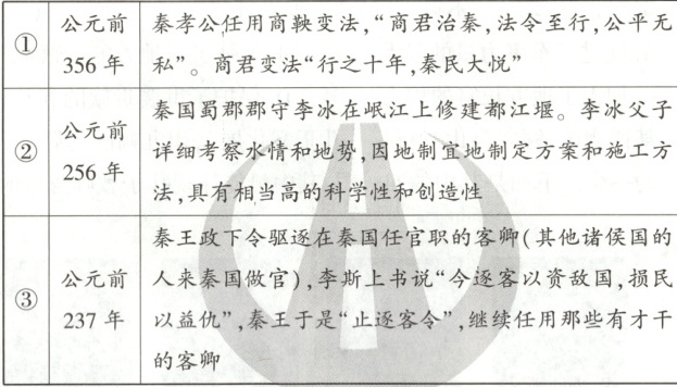 事件:①③。说明:秦国通过商鞅变法,综合国力大为增强,提高了军队战斗力,一跃而成为最强盛的诸侯国,为以后秦统一中国奠定了基础。秦王“止逐客令”使秦国能够广纳贤士、吸收人才,增强了秦国的行政和军事实力,加速了统一的进程。