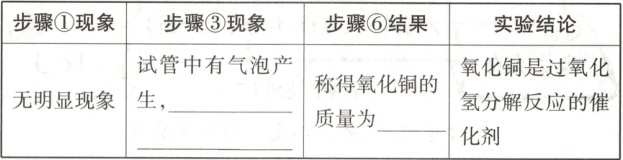 (2)根据实验结论氧化铜是过氧化氢分解反应的催化剂,催化剂能改变化学反应速率,当步骤①中只有过氧化氢溶液时,无明显现象,加入氧化铜后,过氧化氢在氧化铜的催化下分解生成氧气和水,则步骤③中可观察到试管中有气泡产生,带有火星的木条复燃;催化剂在化学反应前后质量不变,所以步骤⑥结果称得氧化铜的质量还是0.2g。