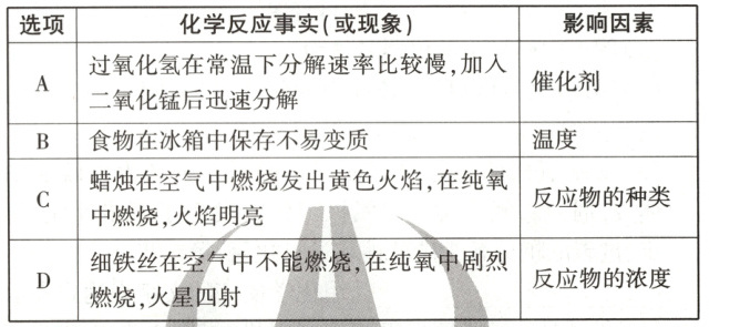 D.细铁丝在空气中不能燃烧,在纯氧中剧烈燃烧,火星四射,是因为氧气的浓度不同,所以影响因素是反应物的浓度,故D正确,不符合题意。