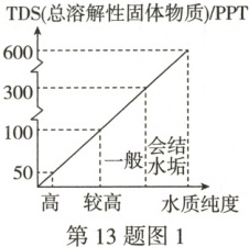 (2)进行水质检测时,可用市售的水质检测笔直接读出水质的TDS值,以判断水质纯度,如图1所示。若通过水质检测笔测出的TDS为450PPT,则水质纯度为________,使用这样的水会给生活和生产带来许多麻烦,请举一例说明:_。