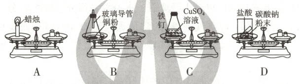 B.玻璃导管与外界相通,加热铜粉消耗氧气,外界空气会进入锥形瓶,反应后天平不再水平平衡,故B不符合题意;