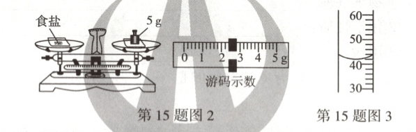 (2)①图2中天平右盘中的砝码质量为5g,游码对应示数为2.4g,所以食盐的质量为7.4g;在称量12.5g食盐的过程中,天平的指针向左偏转,说明食盐加多了,所以应取走适量食盐。