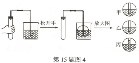 (3)检查装置的气密性时,若装置的气密性良好,则松开手一段时间后,试管冷却,气体体积收缩气压减小,导管口出现的现象是在玻璃导管内形成一小段液柱,故选丙。