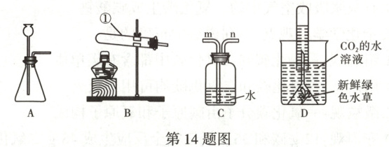 (选填“m”或“n”)端通入。(4) 将CO₂的水溶液转移至烧杯,并组装装置如图D所示,置于阳光下一段时间,观察到有气泡产生。检验该气体的方法是